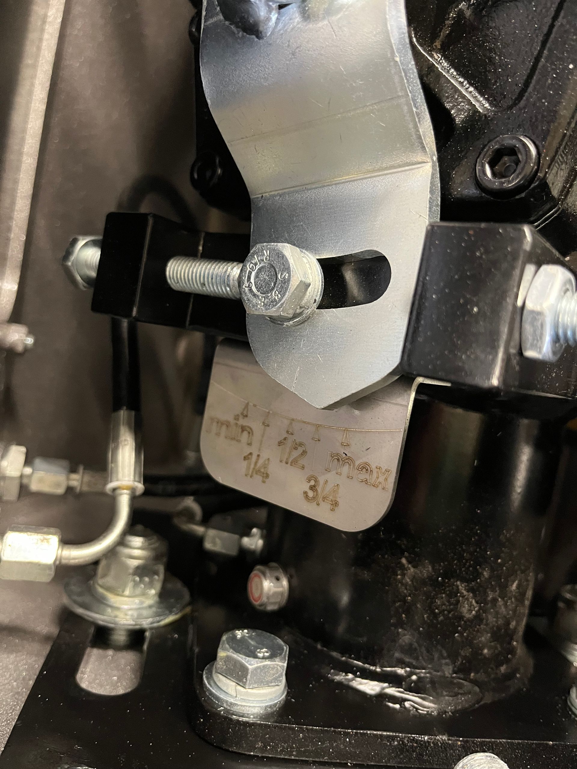 Die Position des silbernen Winkels gibt mit Hilfe der Skala an, welches Schluckvolumen am Motor eingestellt ist.