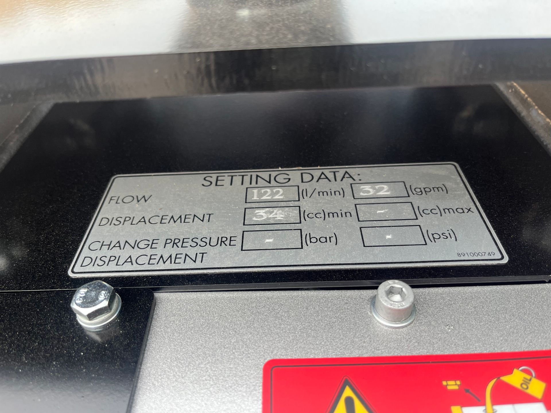 Das Schild "SETTING DATA" gibt Aufschluss über die Einstellung des Motor Schluckvolumens. In diesem Fall ist der Motor auf 34cc eingestellt und benötigt rund 70-90l/min, maximal 122l/min.